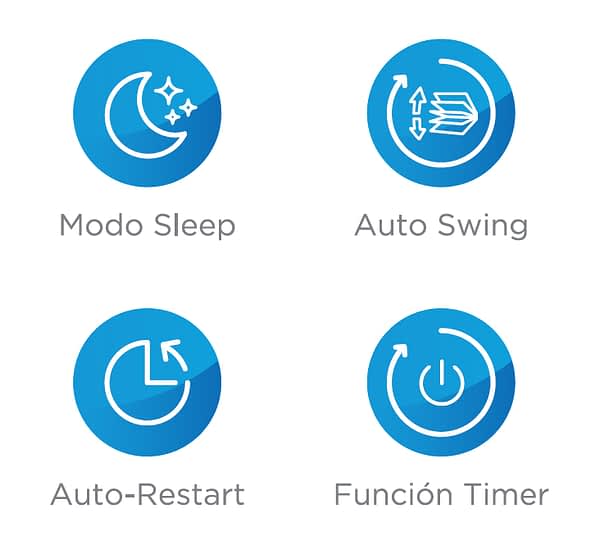 Modo Sleep (Sueño): Dormir con aire acondicionado es un placer, pero despertarse congelado no lo es. La función Sleep ajusta la temperatura gradualmente durante la noche. El equipo aumenta levemente la temperatura a medida que tu cuerpo se relaja y baja su temperatura basal, garantizando un descanso profundo, sin interrupciones por frío y ahorrando energía mientras duermes.