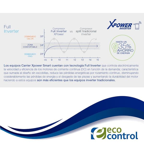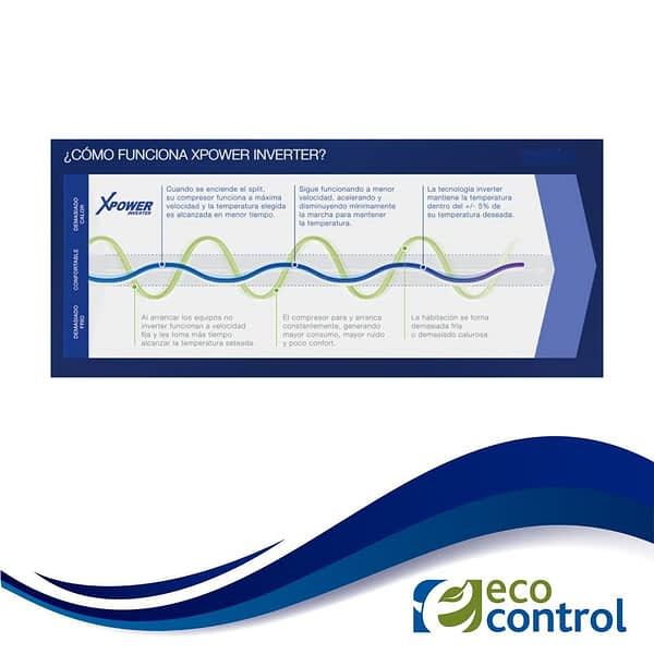 El apellido “Xpower” es sinónimo de rendimiento. Gracias a su compresor con tecnología DC Inverter, el equipo ajusta su velocidad de funcionamiento de manera continua y precisa para coincidir con la demanda de temperatura del ambiente. A diferencia de los equipos tradicionales “On-Off” que desperdician energía en constantes arranques y paradas bruscas, el Xpower Inverter trabaja de forma fluida y estable. Esto garantiza un ahorro de energía de hasta un 35%, amortizando el costo del equipo a través de la reducción en la factura de luz mes a mes. Además, esta tecnología asegura un funcionamiento ultra silencioso y una temperatura constante, sin esos molestos picos de frío o calor.